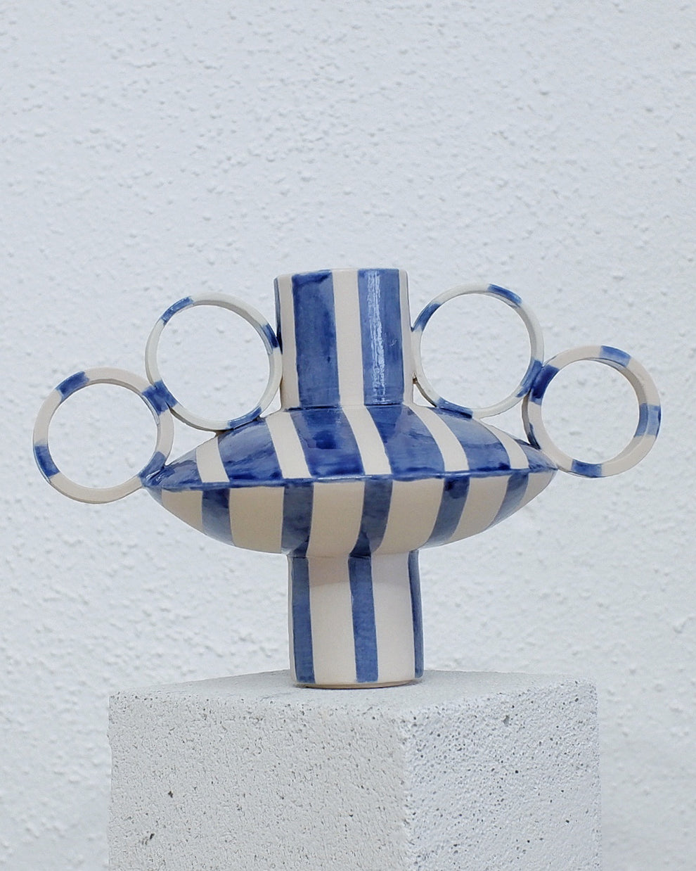 “A staging of how restrictions can enhance creativity. The artist creates vase-like sculptures that play with two separate shapes – a cylinder and a disc-orb – transforming them into various possibilities. By using porcelain as a medium, it is possible to cut the shapes into multiple pieces and place them in a way that creates something new every time. These sculptures are then hand-painted with sharp-edged lines to enhance the contrast of the natural white porcelain. The artist saw comparability to a zebra with its black and white lines and a dinosaur with their multiple handles added in different parts of the sculpture’s body. These animalistic resemblances came to unite the name for this series: Zebrino.”
