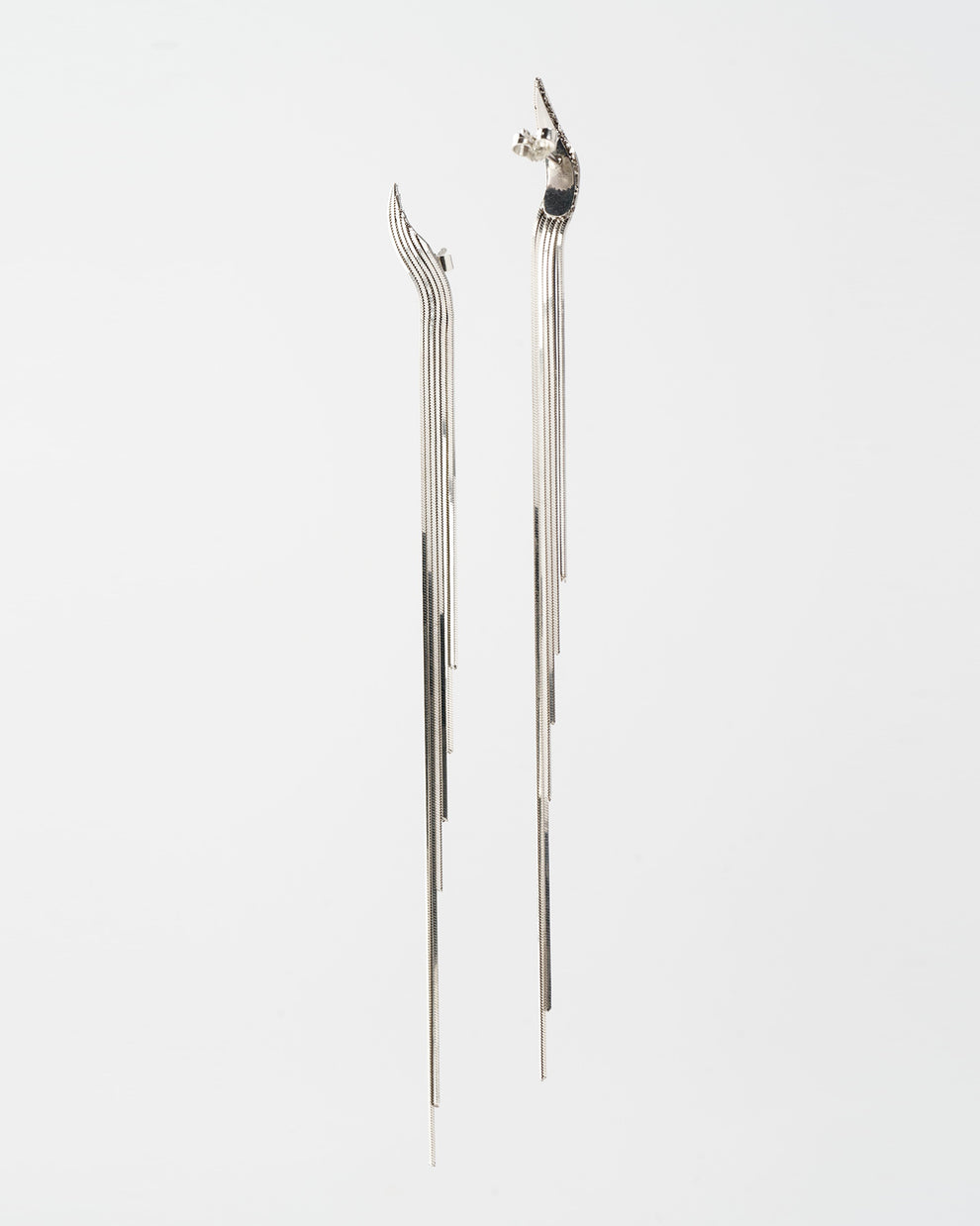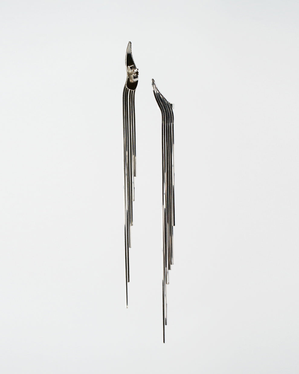 Wie eine Kaskade aus Silber entspringen die Ohrringe mit ihren unterschiedlich langen Kettensträngen dem Ohr bis hin zum Dekolleté. Kraftvoll und doch zart, geschmeidig und beweglich, umspielen sie die Gesichtszüge, umschmeicheln und betonen.