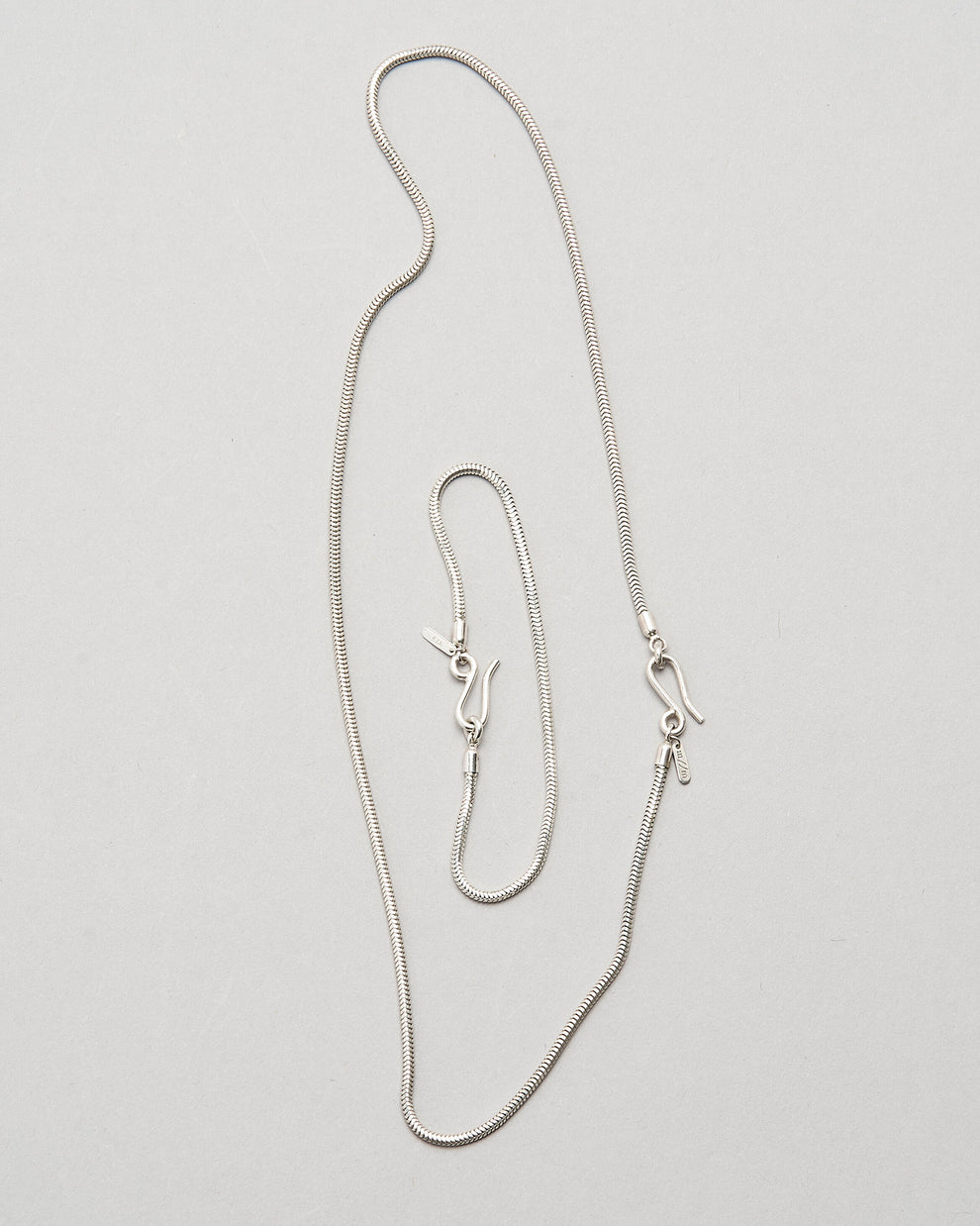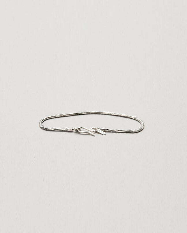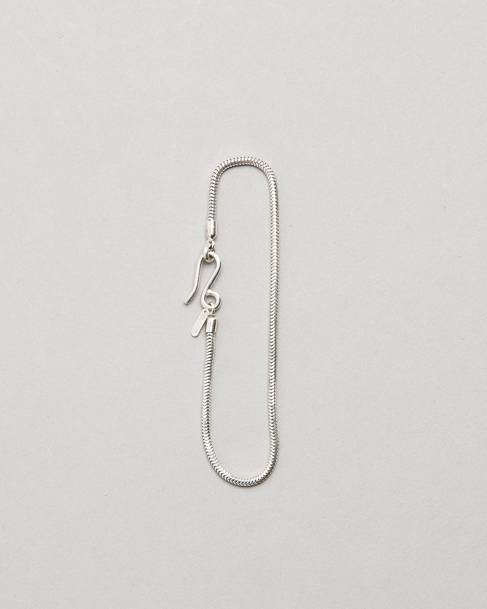 Silken, smooth but firm silver bracelet. Closes easily with a simple hook. A simple highlight to a clean look.