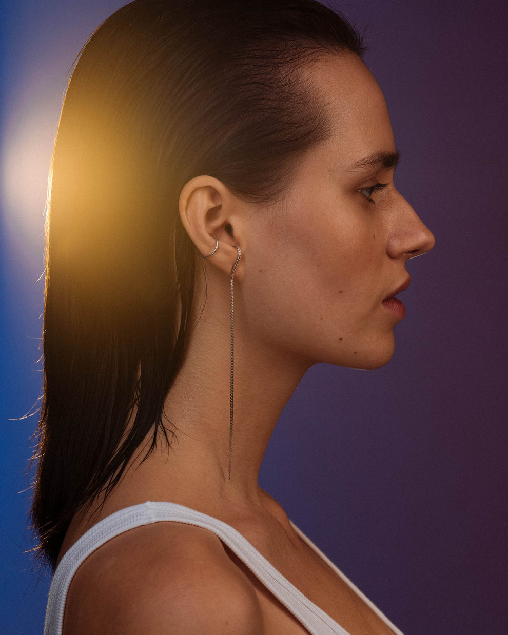The SPRING EARRING is designed to flow out from the inner ear, drop down the earlobe while continuing as a dangling chain that will reflect the light according to your movements.