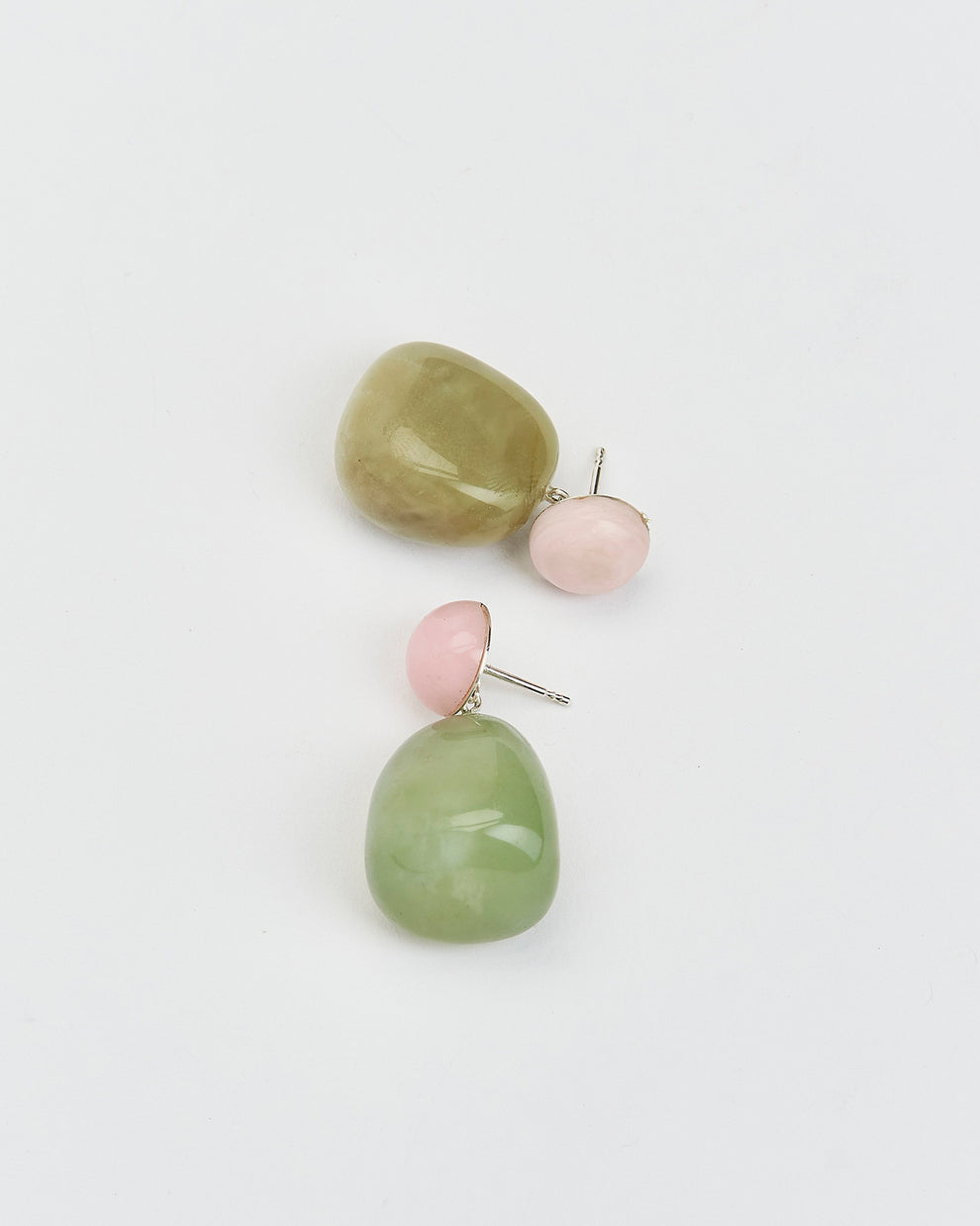 Here, the natural shapes of two semi-precious stones meet organically. The beautiful stones reflect the light and gently adapt to the wearer's movements. A cool addition to any look, elegant statement pieces, clear and without unnecessary frills.