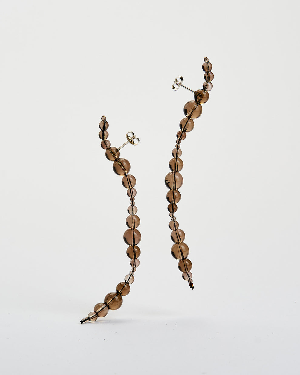 The brown transparent smoky quartz beads of different sizes create an elegant, organic earring that can be worn either as a single piece or as a pair. The ear pin and clasp are made from sterling silver.