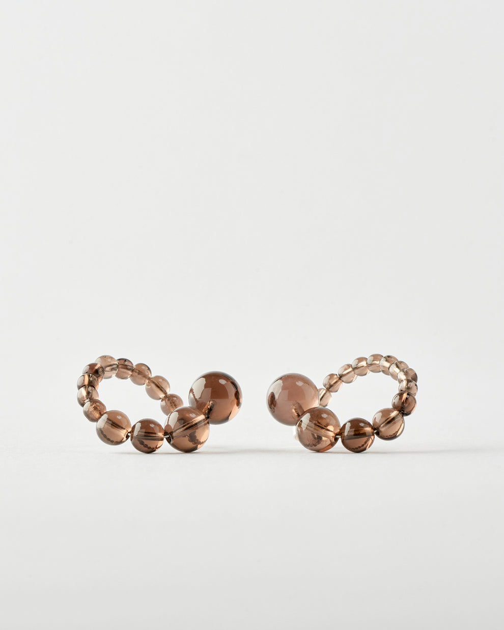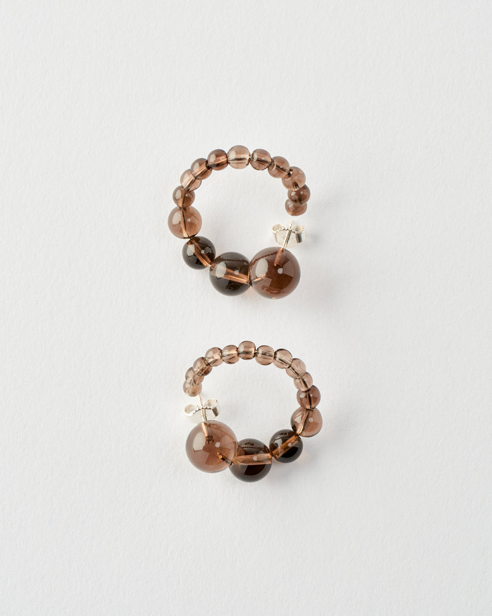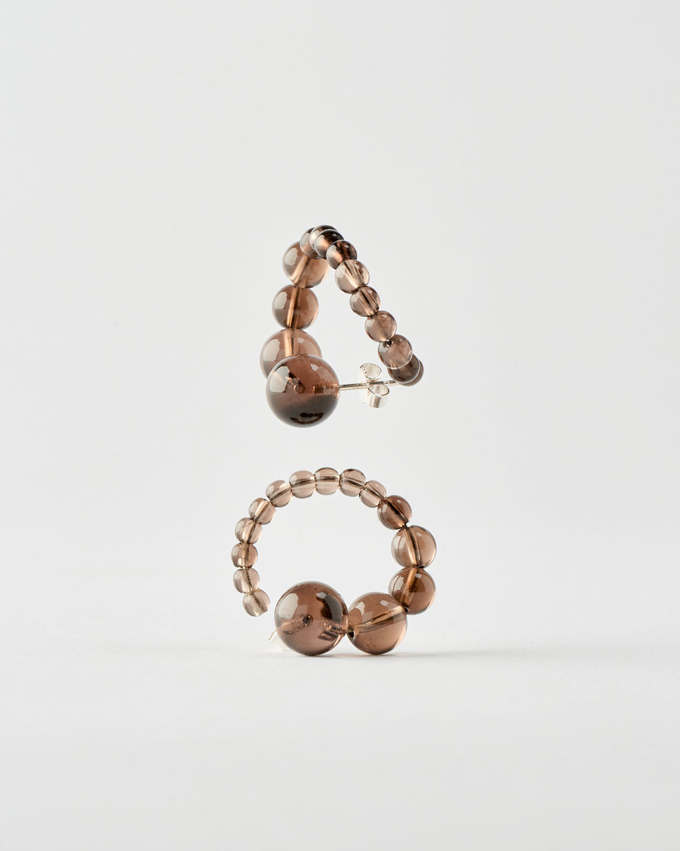 This mini version of the Naruto Hoop is all about boundless energy and playfulness in a pocket-sized form. Crafted from sterling silver, the pin and fastener secure a series of different-sized smoky quarz spheres, beaded together to evoke the dynamic tidal whirlpools of Naruto.