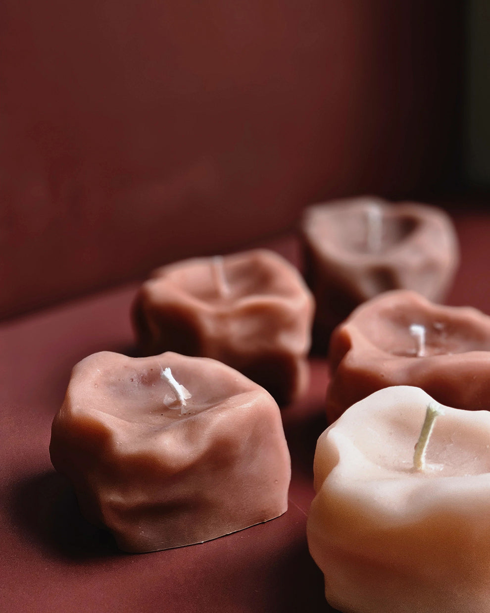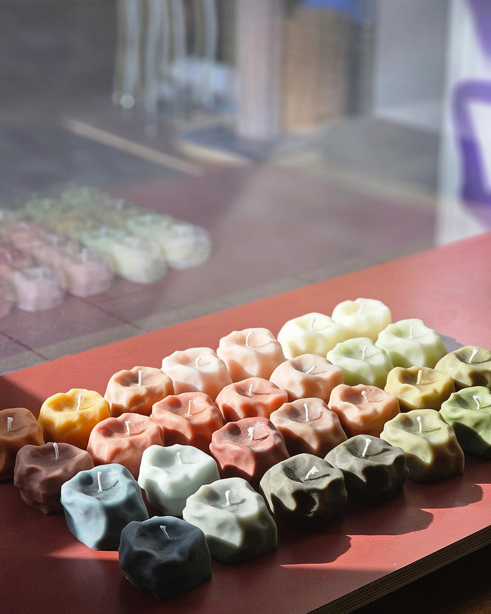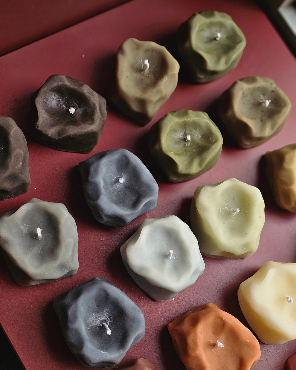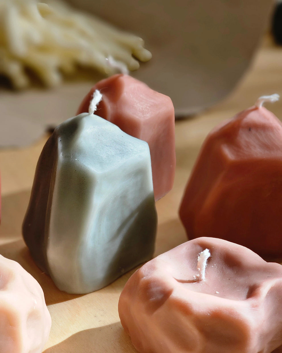 Jede Kerze wird einzeln modelliert und mit natürlichen Pigmenten eingefärbt – so entstehen feine Farbnuancen und organische Strukturen, die jedes Stück zu einem Unikat machen.