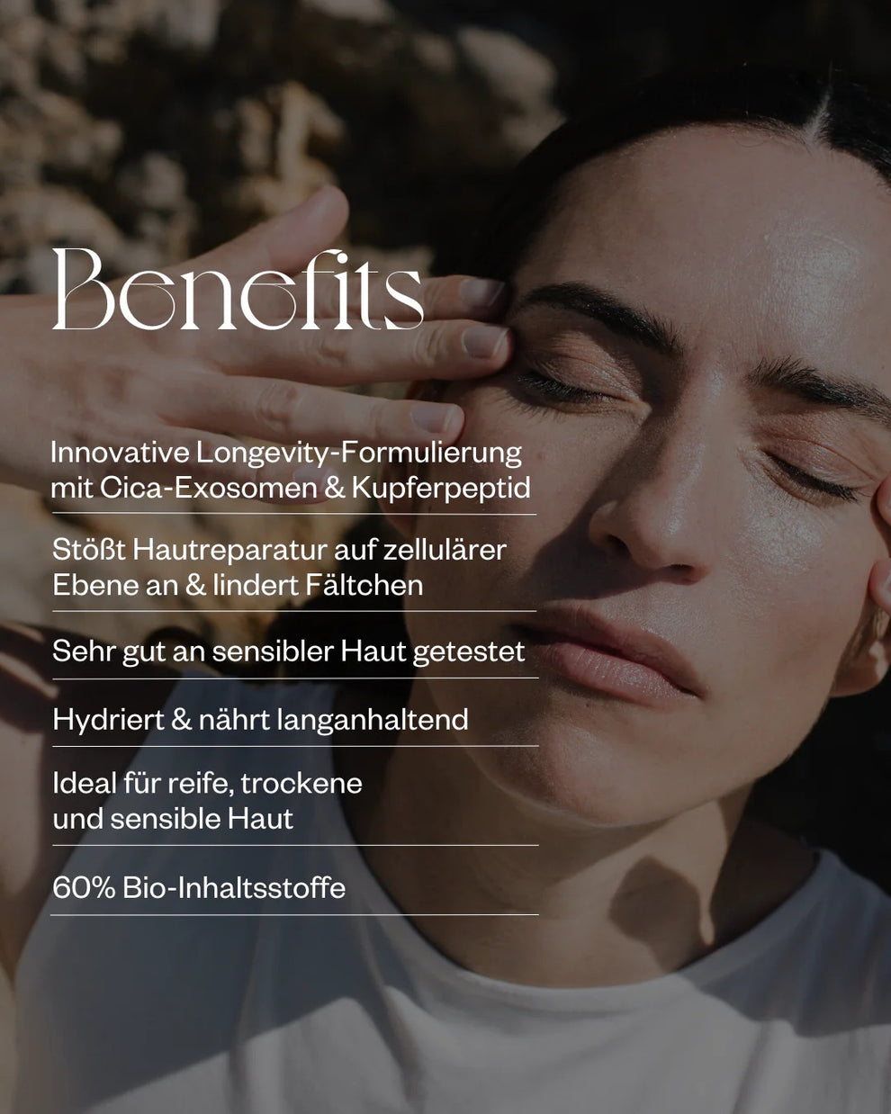2% plant-based CICA exosomes, one of the most exciting innovations in modern skincare, and 0.5% nature-identical copper peptides act as natural cellular messengers. They promote the skin's natural repair and regeneration processes, stimulate collagen and elastin synthesis, and can reduce lines and wrinkles.