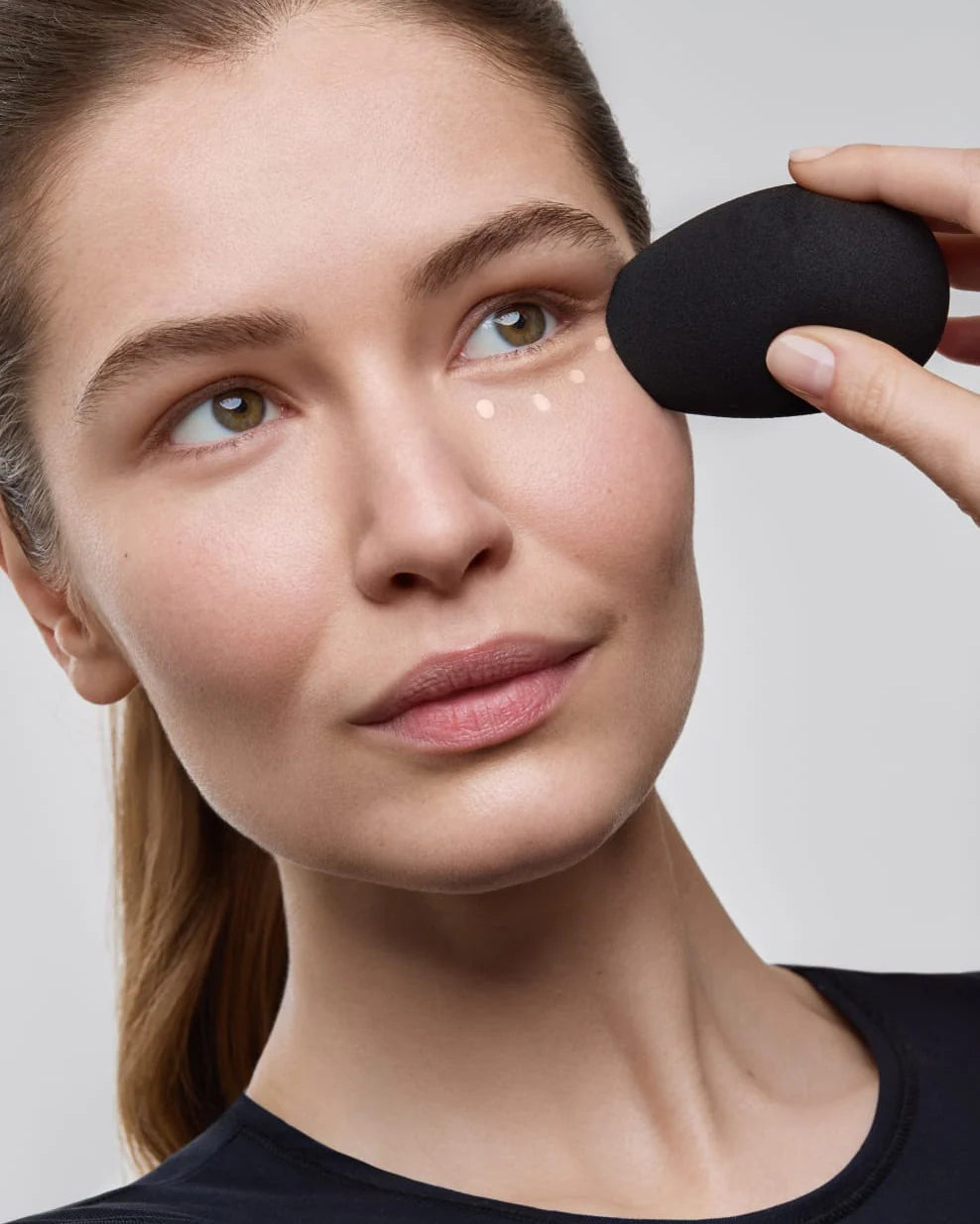 Nachhaltiger Make-up Blender in aufregendem Schwarz aus 95 % Bio-Polyurethan, gewonnen aus Mais, Maniok und Zuckerrohrsaft. Vor der Verwendung leicht angefeuchtet, lässt er Deine Foundation gleichmäßig und makellos mit der Gesichtshaut verschmelzen.