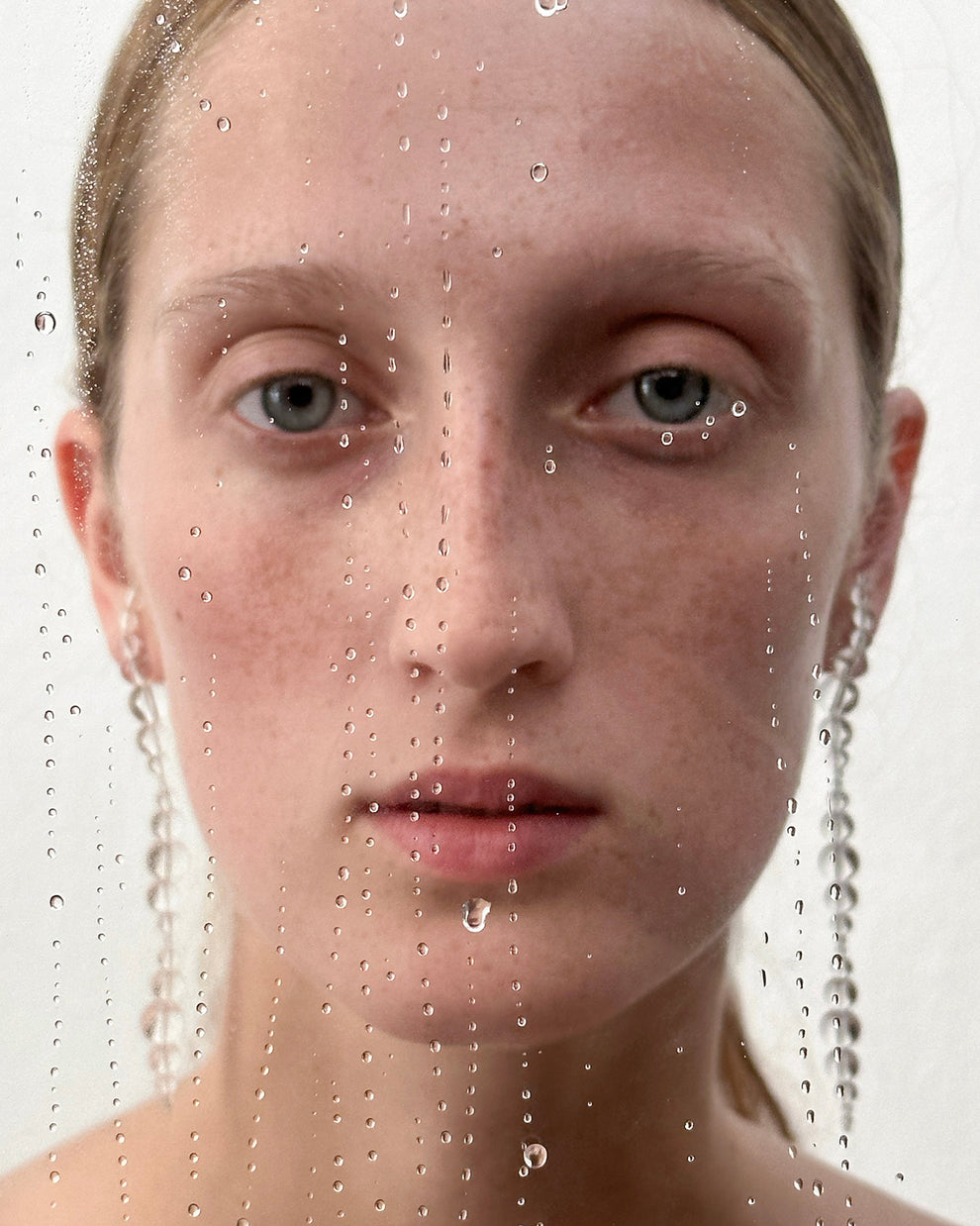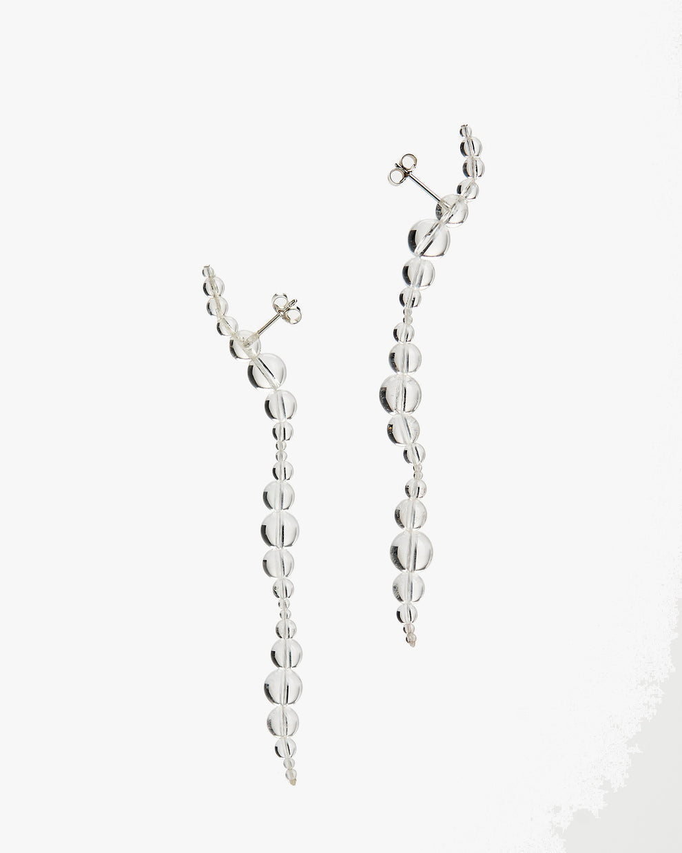 Bergkristall-Perlen verschiedener Größe schimmern wie klare Tautropfen an einem Strang und ergeben einen verspielten, organischen Ohrring, der entweder als Einzelstück oder als Paar getragen werden kann. Ohrpin und Verschluss sind aus Sterlingsilber gefertigt.