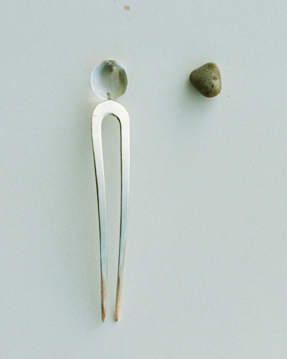 Konturen aus handpoliertem Silber gleiten durch dein Haar und umschließen deinen Kopf.