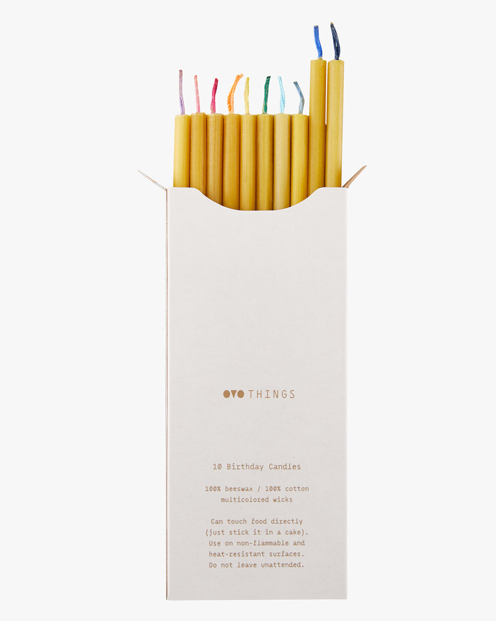 Die OVO Things Bienenwachs-Geburtstagskerzen erstrahlen in schlichter Schönheit. So einfach die Idee, so überzeugend das Ergebnis: hier geben die Dochte (100 % Baumwolle) den Ton an! Das Set mit 10 Kerzen hat Dochte in verschiedenen wunderschönen Farbtönen. Die Geburtstagskerzen sind aus reinem Bienenwachs hergestellt. Sie sind nicht chemisch behandelt und es werden auch keine künstlichen Farb- oder Duftstoffe hinzugefügt! Das bedeutet sie können direkt mit Lebensmitteln in Berührung kommen und auch direkt in den Geburtstagskuchen gesteckt werden. lass den Kuchen nur vorher abkühlen! Du kannst die Kerzen natürlich auch in unserem OAK Kerzenhalter platzieren!