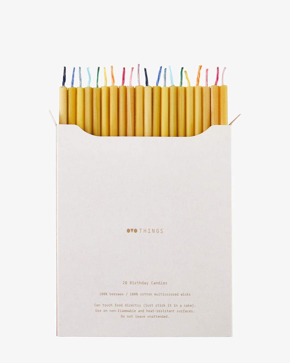 Die OVO Things Bienenwachs-Geburtstagskerzen erstrahlen in schlichter Schönheit. So einfach die Idee, so überzeugend das Ergebnis: hier geben die Dochte (100 % Baumwolle) den Ton an! Das Set mit 20 Kerzen hat Dochte in verschiedenen wunderschönen Farbtönen. Die Geburtstagskerzen sind aus reinem Bienenwachs hergestellt. Sie sind nicht chemisch behandelt und es werden auch keine künstlichen Farb- oder Duftstoffe hinzugefügt! Das bedeutet sie können direkt mit Lebensmitteln in Berührung kommen und auch direkt in den Geburtstagskuchen gesteckt werden. lass den Kuchen nur vorher abkühlen! Du kannst die Kerzen natürlich auch in unserem OAK Kerzenhalter platzieren!