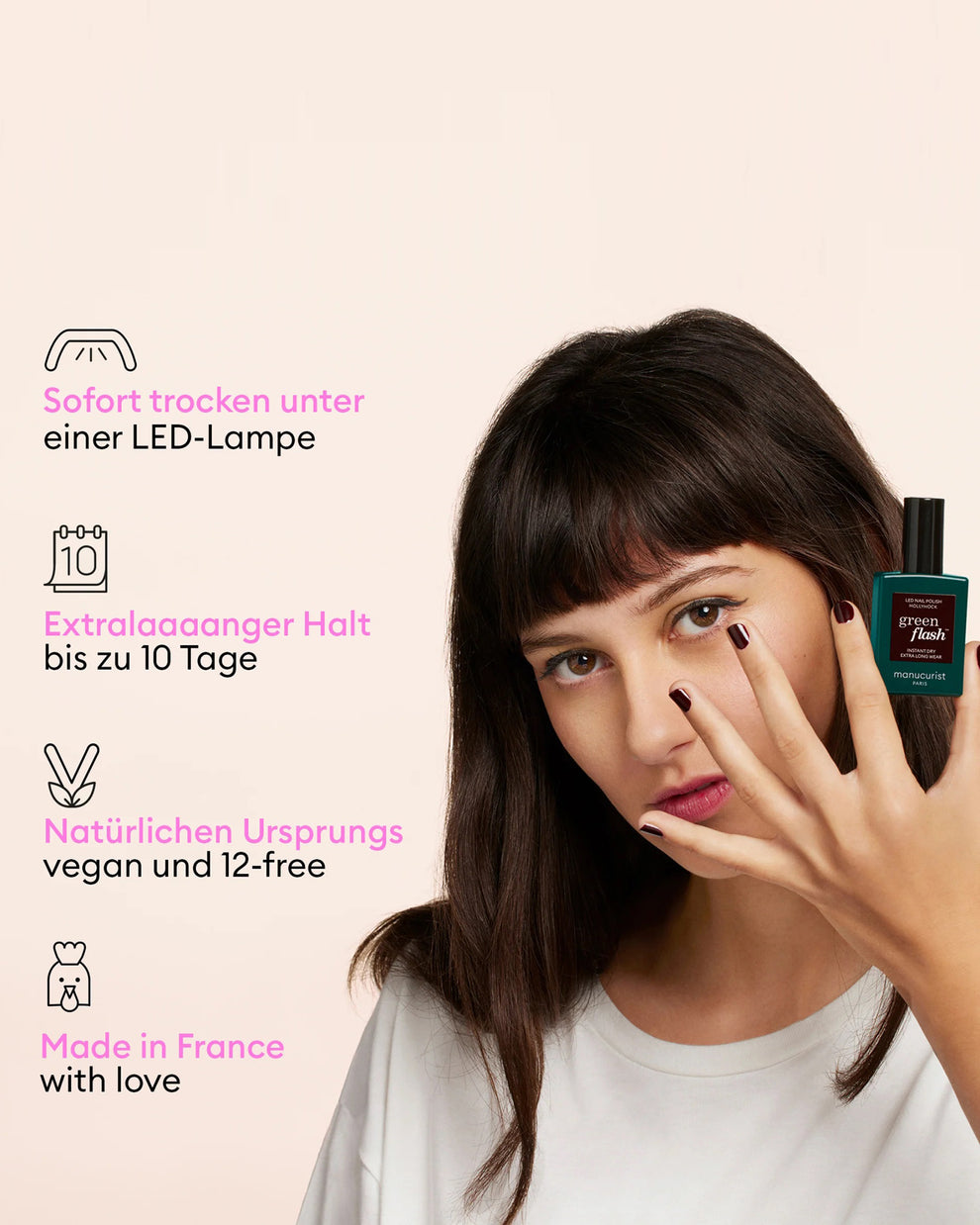 Die bio-basierte und vegane Formel des Green Flash™ LED-Nagellacks ist für AnwenderInnen jeder Erfahrungsstufe geeignet. Mit dem Pinsel in Profiqualität, der starken Pigmentierung und dem intensiven Glanzgrad, kannst du einen außergewöhnlichen Look kreieren. Der Lack hält bis zu 10 Tage und trocknet sofort unter der LED-Lampe. Aufgetragen und entfernt wird der Flash™ LED-Nagellack wie ein herkömmlicher Nagellack. Green Flash™ LED-Nagellack wird aus Rohstoffen wie Rohrzucker, Weizen, Kartoffeln und Mais hergestellt. Um optimale Ergebnisse sicherzustellen, benötigst du mindestens: Einen Base Coat von Green Flash™, einen Farblack von Green Flash™, einen Top Coat von Green Flash und eine LED-Lampe mit einer Leistung von mindestens 24 Watt.