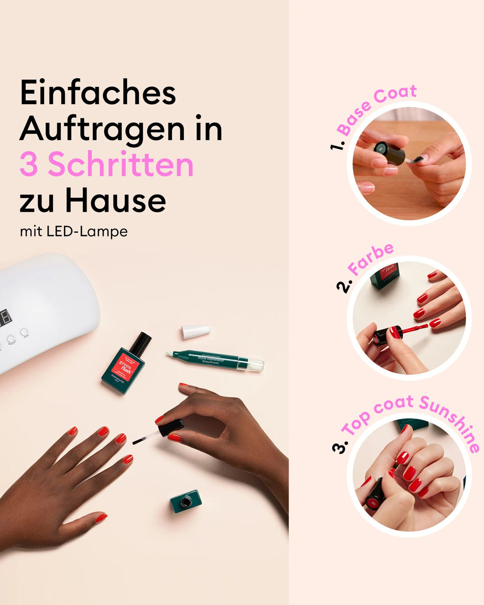 Wenn du weißt, wie man klassischen Nagellack aufträgt, kannst du auch Green Flash™ auftragen: erst die Grundierung, die Farbe und dann den Topcoat. Der einzige Unterschied besteht darin, dass du ihn dann unter der Lampe trocknen lässt!
