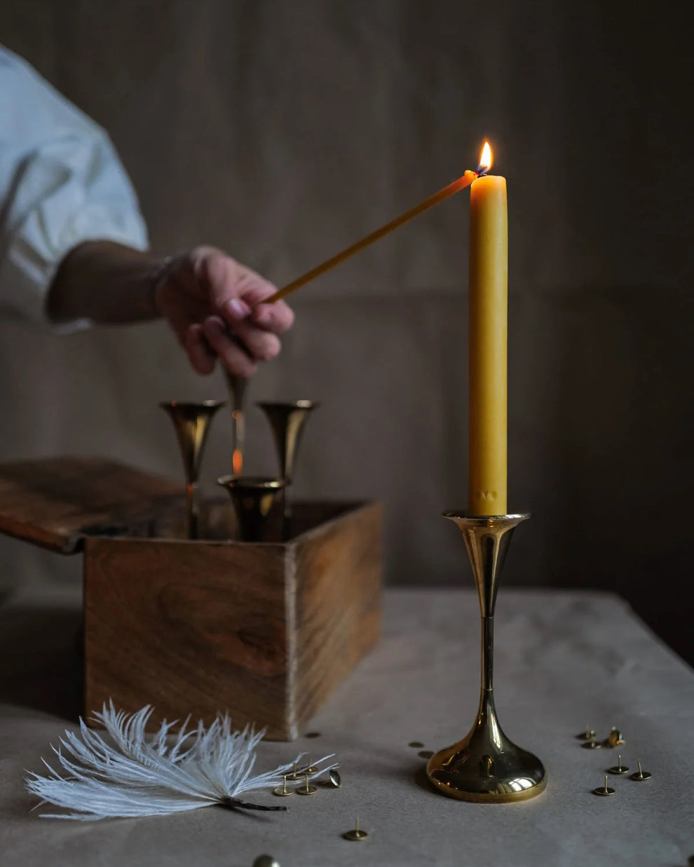 Klassische Bienenwachskerzen mit Standarddurchmesser, die in jeden herkömmlichen Kerzenhalter passen. Die Kerzen werden in einer lokalen Werkstatt in Litauen aus heimischem Bienenwachs handgefertigt.