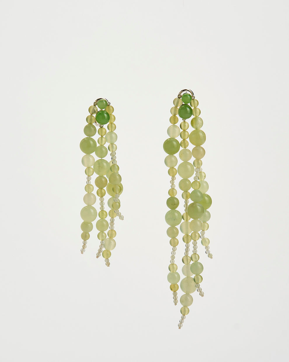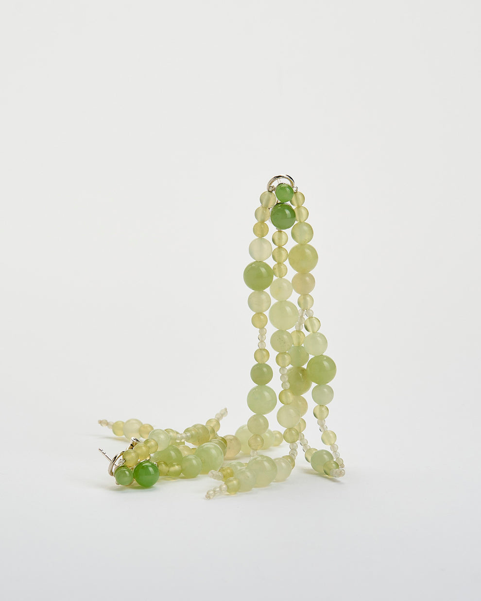 Wie eine Kaskade aus Perlen entspringen die Ohrringe mit ihren unterschiedlich langen organischen Kugelsträngen aus hellgrünem Jade dem Ohr. Ein wirkliches Statement Piece das du in zwei Größen bekommen und entweder asymmetrisch als Einzelstück tragen kannst oder als Paar.