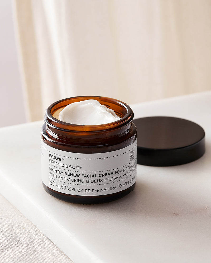 Für normale bis trockene Haut! Mit der Nightly Renew Cream präsentiert Evolve ein Nachtpflegeprodukt für einen erholten Glow am Morgen. Diese reichhaltige und nährende Nachtcreme wurde entwickelt, um die Haut im Schlaf zu entgiften und gleichzeitig feine Linien und Fältchen zu glätten und aufzupolstern. Sie enthält natürliche Inhaltsstoffe wie Pfingstrosenextrakt, das die Zellerneuerung anregt, die Zellvitalität steigert, damit die Haut verjüngt und gleichzeitig den Zeichen der Hautalterung vorbeugt. Es wirkt zudem antienzündlich, antioxidativ und sorgt für eine natürliche Strahlkraft der Haut.