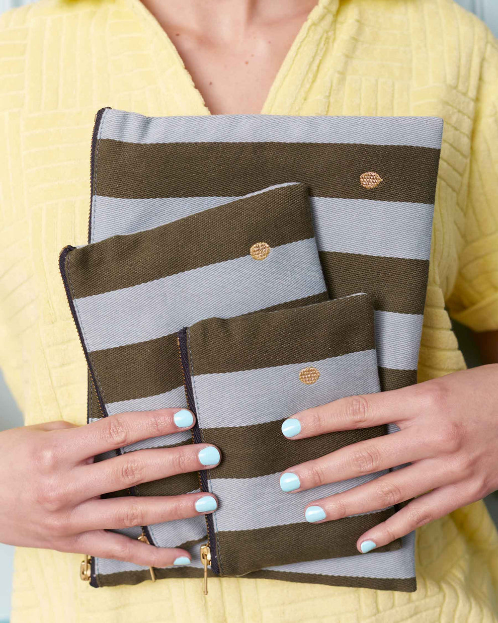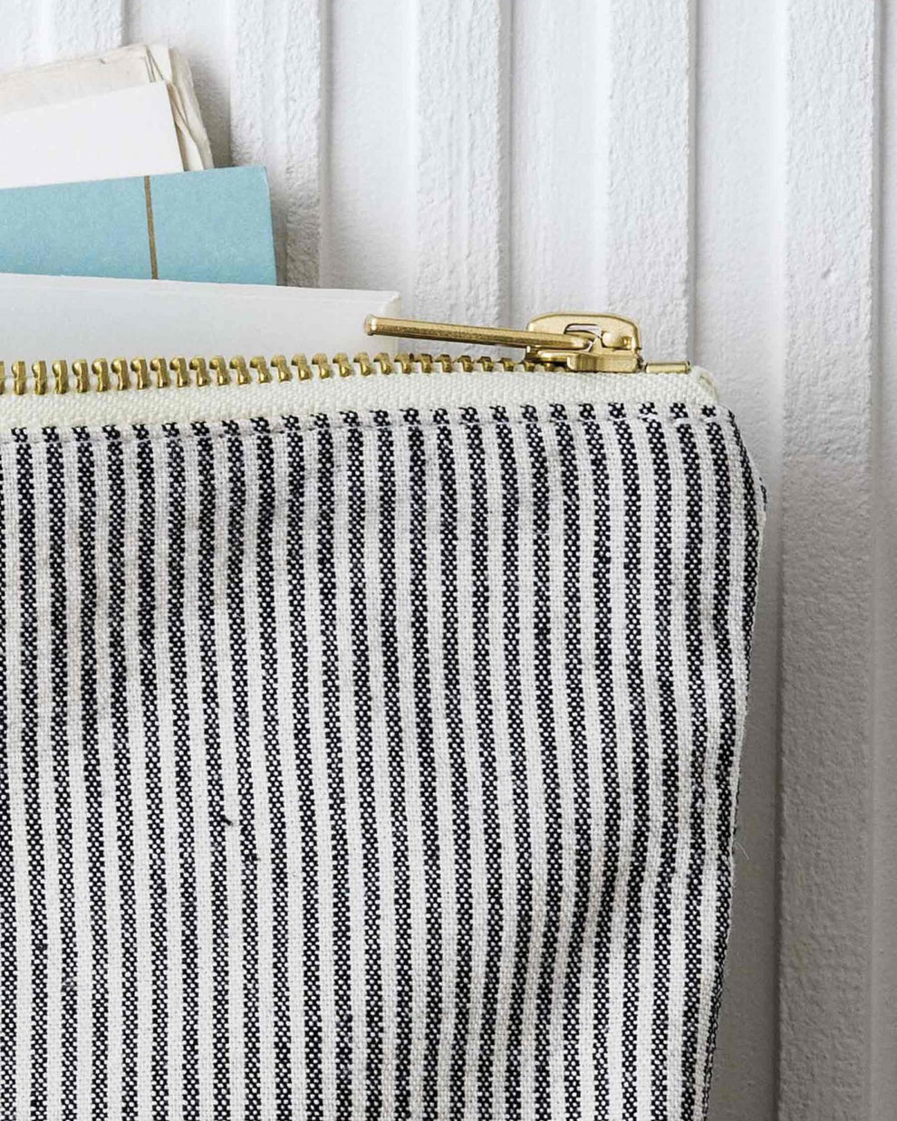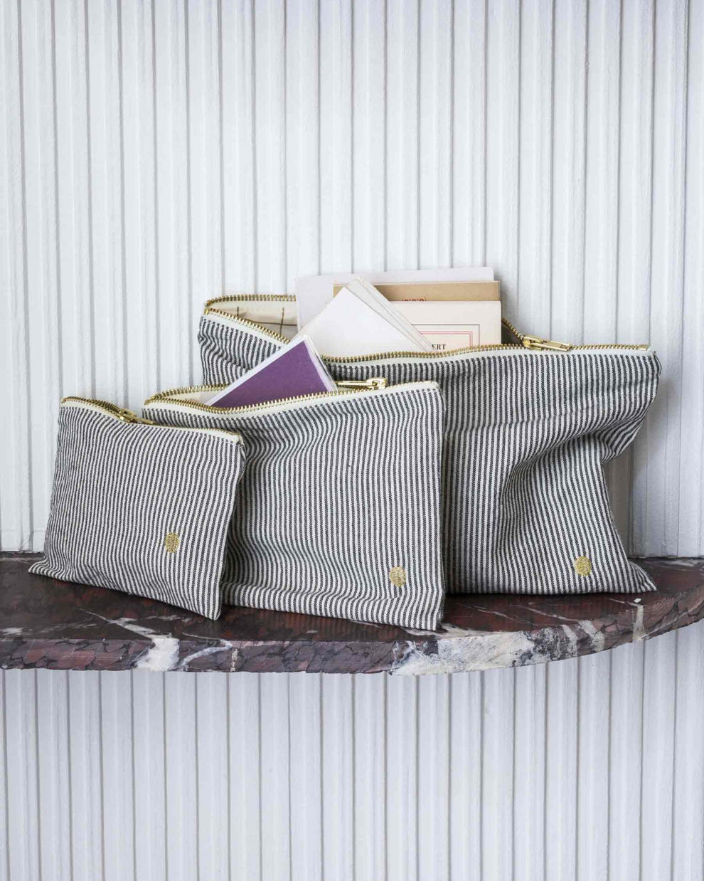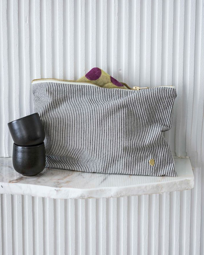 Die hübsche Kosmetiktasche ist mit ihren kleineren Schwestern in Small und Medium ein tolles Set. Die Taschen von la Cerise Sur le Gateau können genauso gut als modisches Accessoire durchgehen. Erhältlich ist die Large-Variante in herbstlichem Dunkelgrün, fein gestreift, blau kariert oder in zartem Rosa. Was gehört rein? Alles was dir einfällt – Kosmetik, Schmuck, Liebesbriefe, Handy, Lieblingsdinge… Das Oscar Ecru-Innenfutter ist wasserdicht! Die verwendeten Materialien sind aus Bio-Baumwolle und Öko-Textilien. Neu in der Kollektion findet sich eine innovativ behandelte Bio-Baumwolle, welche wasserabweisend und noch widerstandsfähiger ist (Kale & Poivre Rose). La Cerise sur le Gateau produziert die Produkte in einer kleinen Werkstatt in Portugal. Wir empfehlen Handwäsche, doch die Taschen sind sogar bis 30° waschbar.