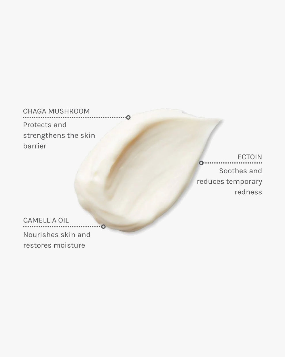 Chaga-Pilze stärken die Widerstandsfähigkeit der Haut während Ectoin und Kamelienöl dabei helfen, Rötungen zu reduzieren, die Haut zu schützen, Feuchtigkeit wiederherzustellen und trockene, schuppige und empfindliche Haut zu lindern.