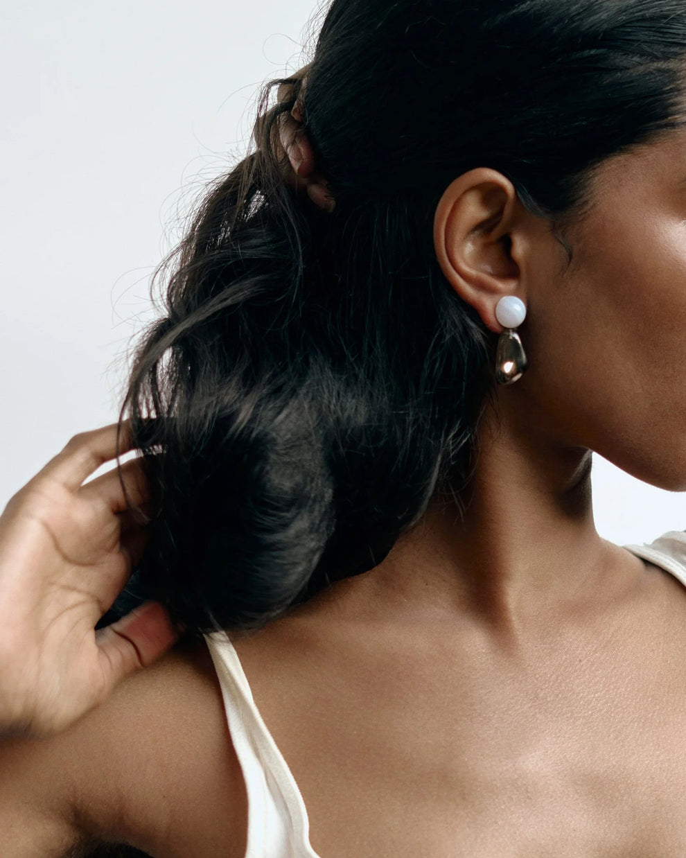 An einem hellblauen Chalzedon-Halbkugel befestigt, hängt ein rauchiger Quarzstein, der sanft mitschwingt und sich mit den Bewegungen der Trägerin bewegt. Jeder Stein ist in Farbe und Form einzigartig – so individuell und besonders wie diejenige, die ihn trägt.