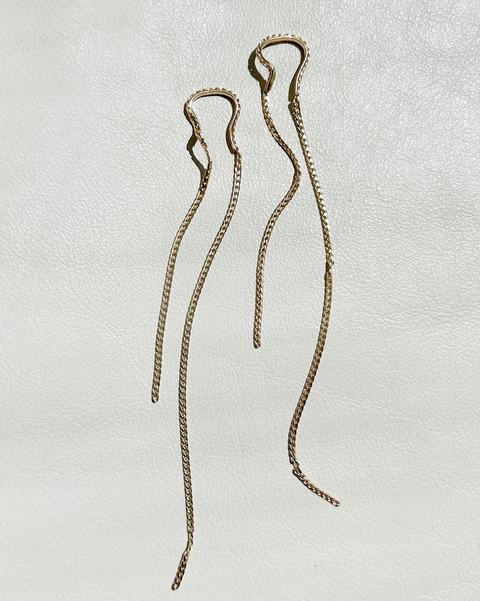 Seidig glatte Ketten gleiten von Vorder- und Rückseite deines Ohrs auf die Schultern herab. In ihrem Ausdruck erinnern sie an die fließende Bewegung eines schmalen Wasserlaufs der über deine Haut streift. Jetzt auch in vergoldetem Sterlingsilber erhältlich!