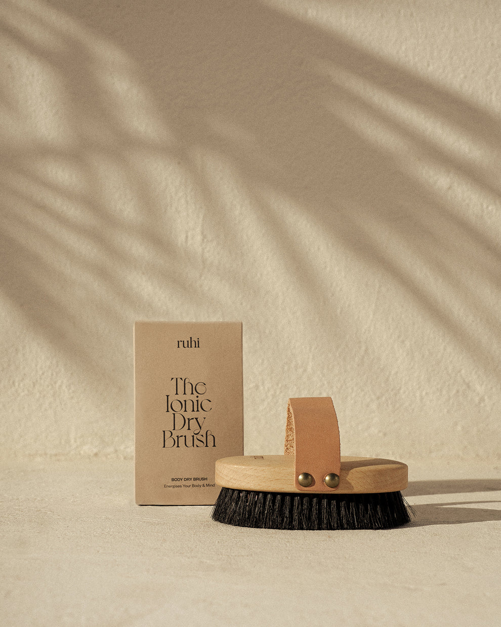 Die ruhi Massagebürste besteht aus ultrafeinen Kupferdrähten, 100% Naturborsten, geöltem, regionalem Buchenholz aus verantwortungsvoll bewirtschafteten Wäldern und einer Schlaufe aus echtem Leder. Sie wird nachhaltig und auf traditionelle Weise in Deutschland gefertigt.